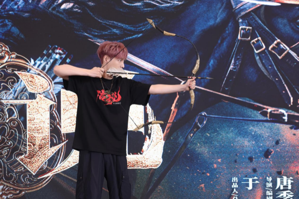 张艺兴说起在新疆拍戏的经历特别兴奋,给人感觉有“使不完的牛劲”。他表示特别喜欢新疆拍戏的节奏:“新疆的白天特别长,就感觉好像一直没有黑天一样,拍打戏从早上一直拍,一问时间,晚上11点了,但天还是亮的,特别喜欢这个节奏。”随后他又在现场展示了自己精心设计过的武器——一把在两边加上短刃的弓。张艺兴透露,这是他饰演的西汉将领华峻使用的武器,既可以远距离射杀敌人,也可以近战对抗敌人:“设计了这个弓之后,大哥就一直陪我套招,我所有的动作都是大哥帮我套的。”成龙则对张艺兴的打戏表现赞不绝口:“艺兴本身是学跳舞的,学动作学得特别快,别人可能一次只记得一两招,他可以记个七八招甚至十几招,很聪明的年轻人。”