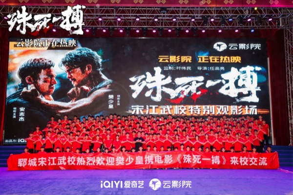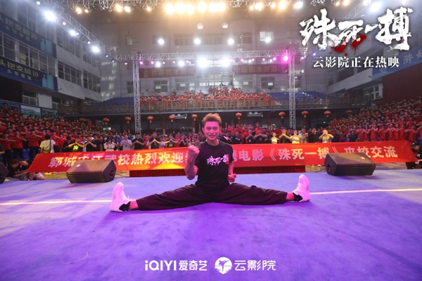 活动当天,宋江武术学校的学员们齐聚,满怀热情地迎接樊少皇的到来。校方为表欢迎,安排了一场声势浩大的欢迎仪式,两千多名学员们在巨大的演武场上,随着激昂的音乐,迅速变换队形,最后武校学员们一同拉开巨型海报为《殊死一搏》加油助阵。