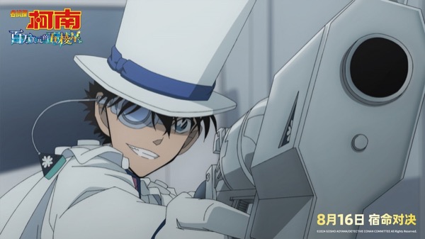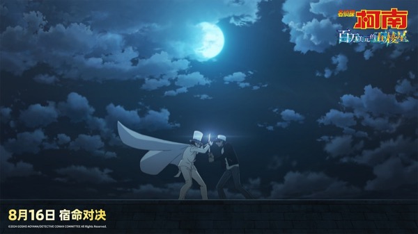 在《名侦探柯南:百万美元的五棱星》今日发布的首款预告中,怪盗基德通过一份预告信宣扬着他的高调回归,也表明了他本次的目标——两把东洼荣龙的短刀。而作为怪盗基德一直以来的劲敌,名侦探柯南则对此发出疑问:“他为什么会盯上这个?”对于一位宝石大盗而言,将目标锁定在刀身上,其中一定暗藏玄机。关西名侦探服部平次也向怪盗基德放出狠话,二人在月光下拔刀开战,平次脑中一闪而过的远山和叶,让人回想起平次与基德二人曾经的“一吻之仇”。刀光剑影之下,平次关键一击划破了基德的帽檐与眼镜,怪盗尴尬地露出半张脸,他的真实身份是否会因此暴露?其背后又藏着怎样的真相?一切亟待大银幕揭晓。
